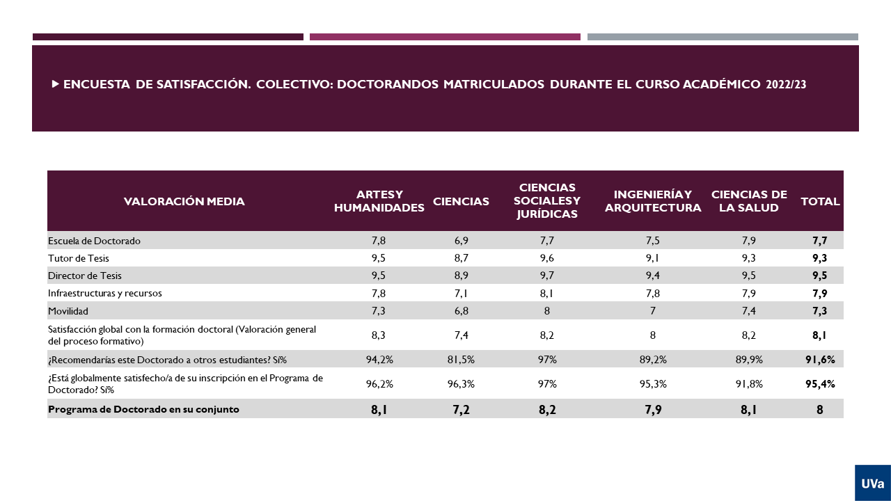 The UVa's Research and Evaluation Office annually collects information on each doctoral programme based on RD 99/2011, UVa's rules for doctoral studies, and the programme's verification report. For this purpose, a set of indicators has been designed in order to evaluate the overall results of each programme.